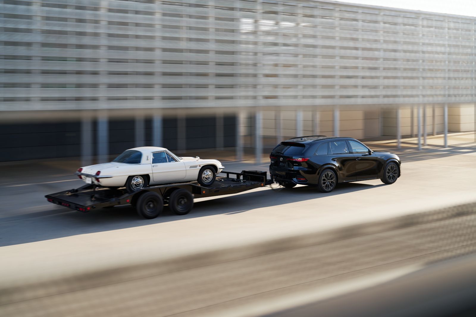 Both vehicles offer 2,268 kg (5,000 lbs) maximum towing capacity when equipped with Mazda Genuine Towing Accessories (GS-L, GT, GT-P, and Signature trims). The base CX-90 GS tows up to 1,588 kg (3,500 lbs).